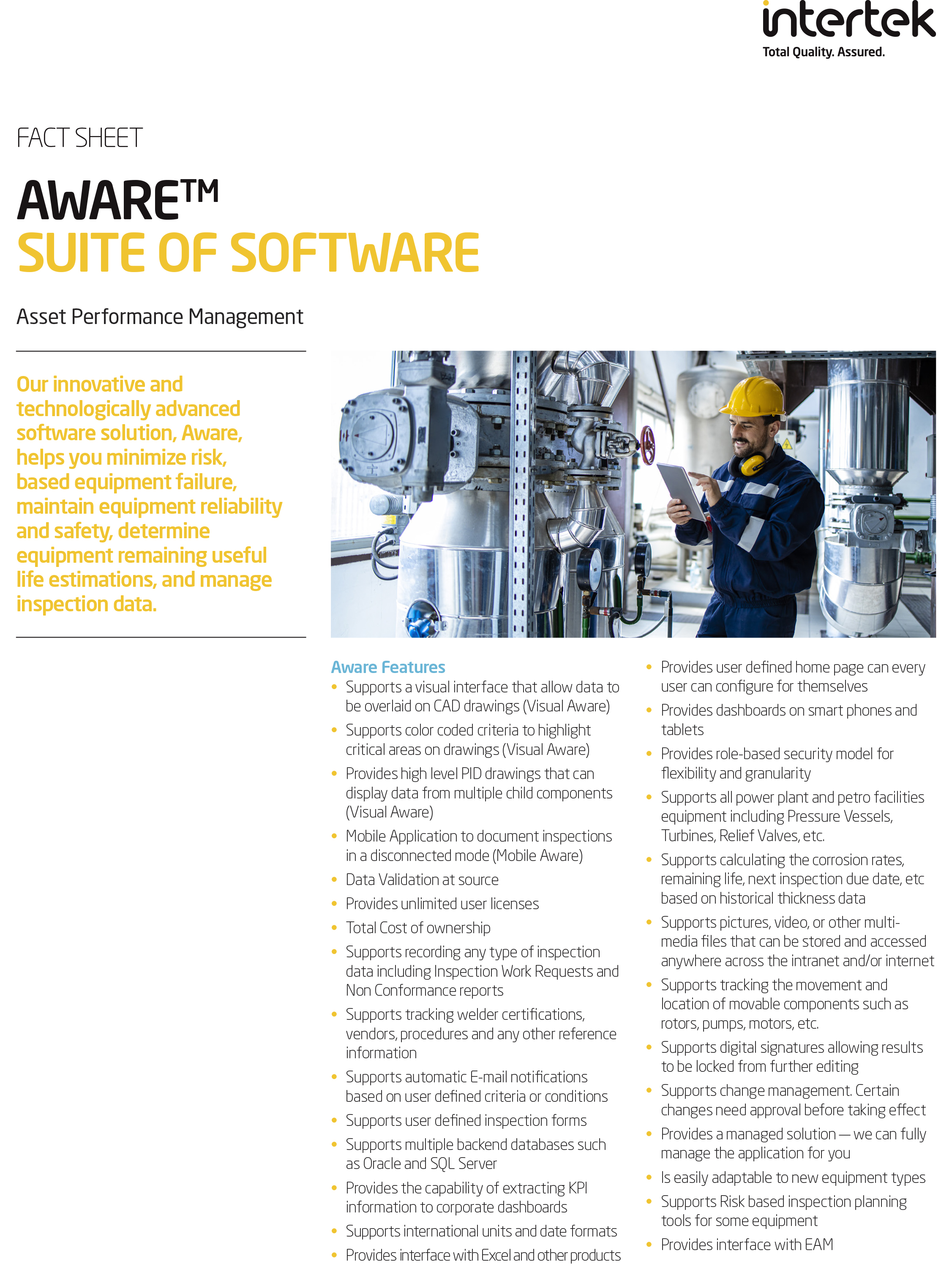Aware APM software for the oil, gas and petrochemical industries is used to organize the inspection information of assets such as piping, pressure vessels, safety relief devices, valves, tanks, and other process equipment. It is the only APM software that utilizes a web-based environment in which users can quickly navigate and visually locate asset information.