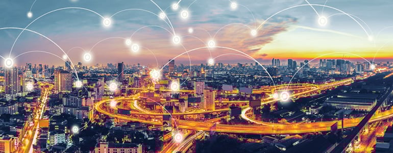 IoT icons and a glowing network on dark blue background.